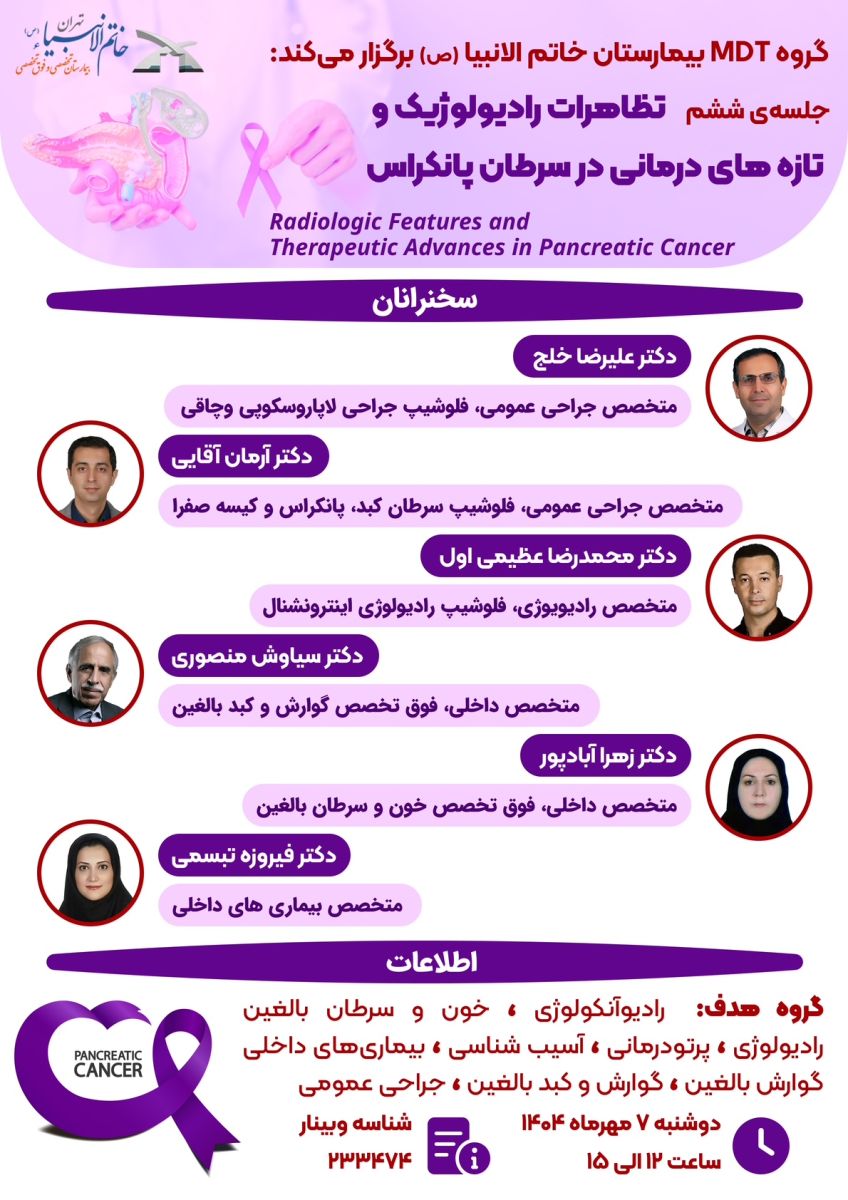 گروه MDT بیمارستان خاتم الانبیاء (ص) برگزار می کند: جلسه ششم تظاهرات رادیولوژیک و تازه های درمانی در سرطان پانکراس